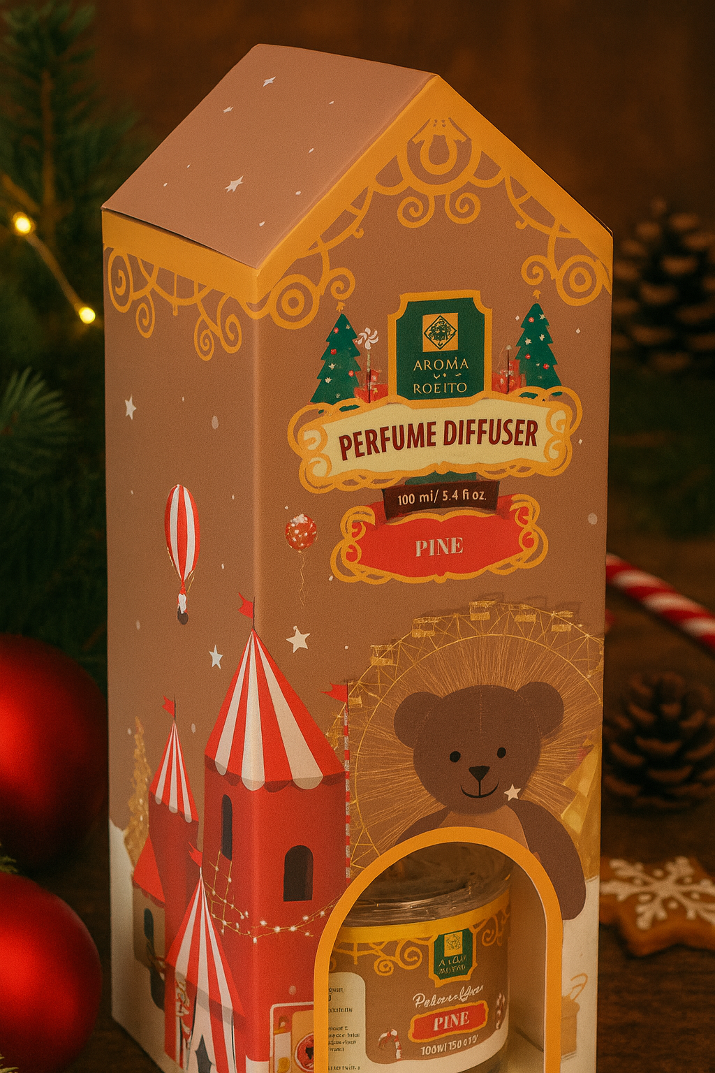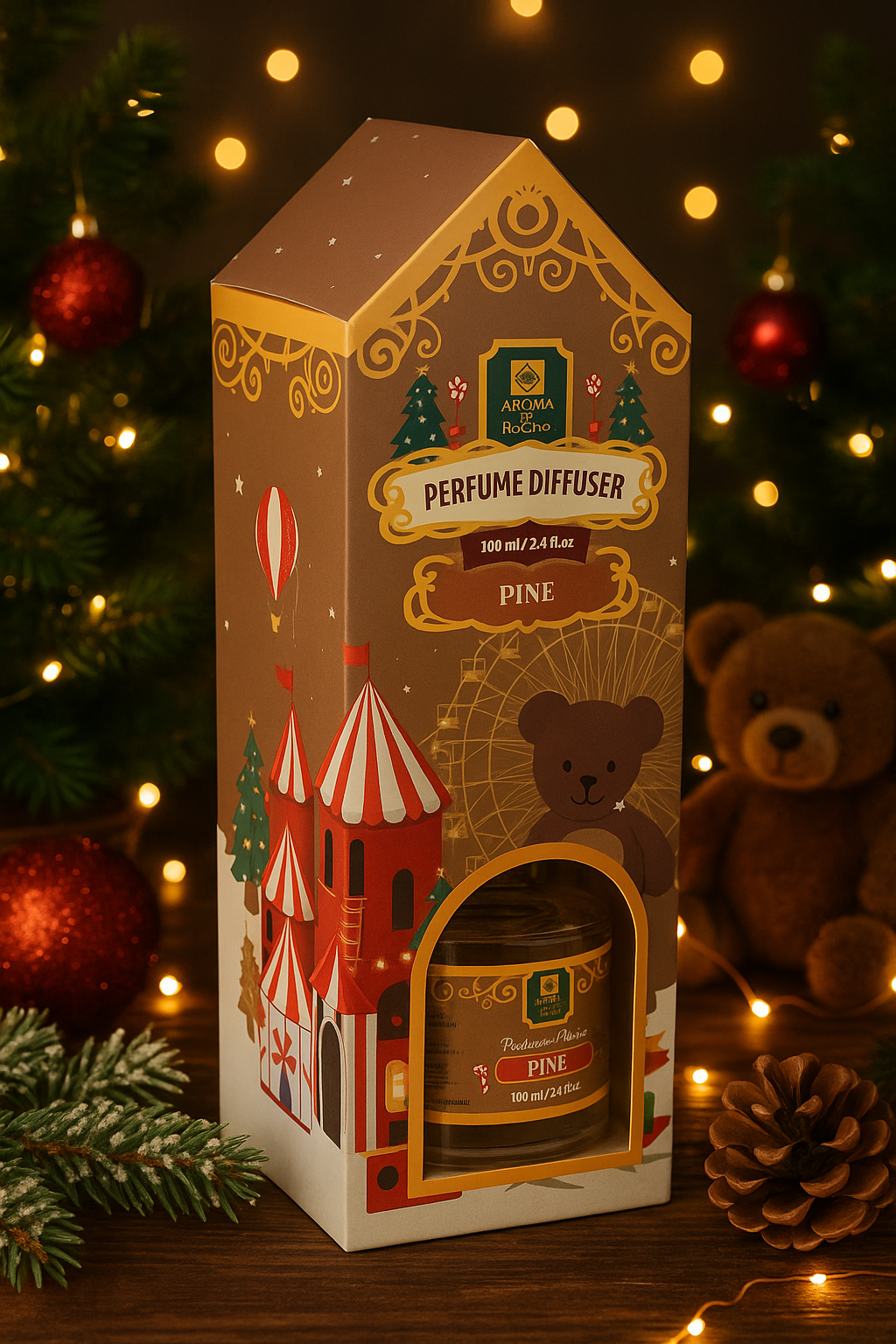 Aromo Set Craciun, 100ml, Pine este creat pentru a aduce magia sarbatorilor direct in casa ta. Cu un design festiv inspirat de lumea Craciunului, acest set transforma orice incapere intr-un spatiu cald, primitor si plin de atmosfera de iarna.
