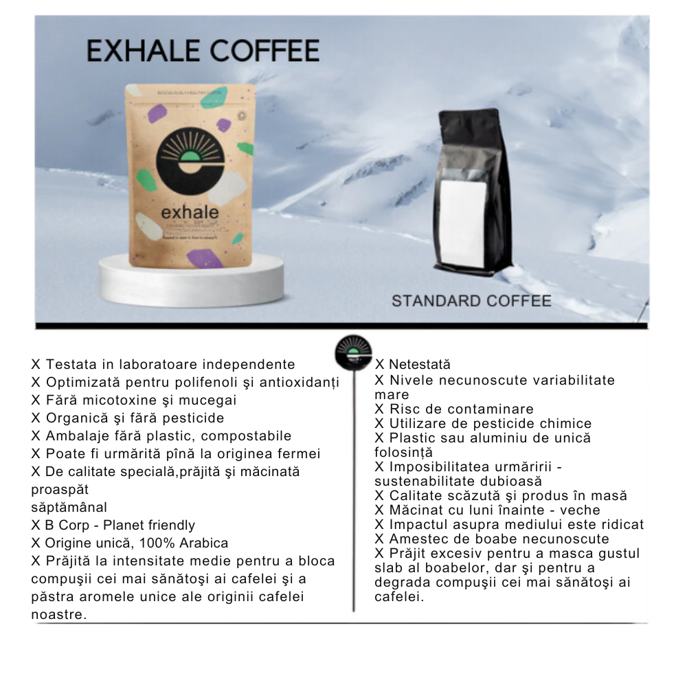 Dar ceea ce ne diferentiaza cu adevarat este atentia noastra deosebita acordata sigurantei si calitatii. Aceasta cafea este testata in laboratoare independente pentru a confirma absenta micotoxinelor, mucegaiului, pesticidelor si metalelor grele. Certificarile noastre sunt atasate cu mandrie, garantandu-ti ca fiecare ceasca de cafea pe care o savurezi este pura si sigura pentru consum.Spune adio cafelei fade de supermarket si incearca o cafea organica care iti va schimba radical perspectiva!