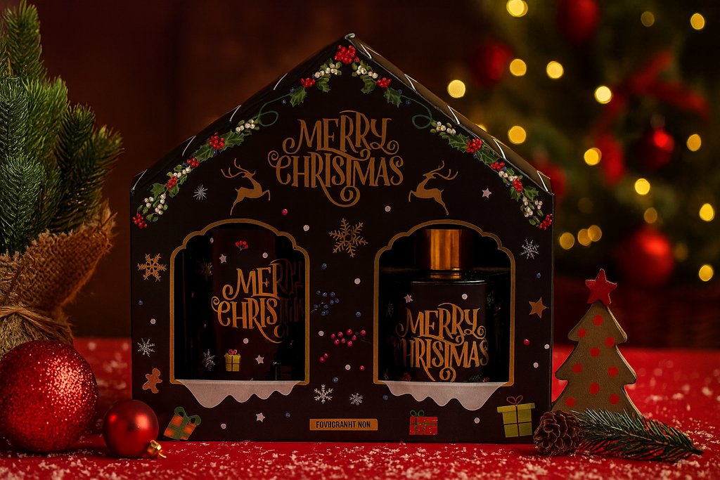 Lumanarea parfumata raspandeste o lumina blanda si o aroma luxurianta, in timp ce parfumul ambiental completeaza atmosfera cu accente bogate si fructate. Ambalajul premium, in nuante de negru cu detalii aurii si motive de Craciun, il transforma intr-un cadou ideal pentru cei care apreciaza aromele elegante si decoratiunile rafinate.